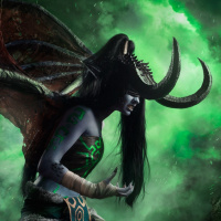 the Warcraft universe. This character is known for being a demon, specifically a succubus or similar type of creature, given her horns and pointed ears. She is standing in