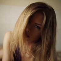 blonde hair. She is looking off to the side, her expression serious or thoughtful. Her gaze is directed away from the camera, which creates an intimate and introspective mood in the image. The background is softly focused, which suggests that she might be indoors, perhaps in a bedroom or sitting area with