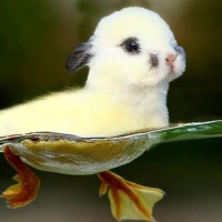 The image shows a yellow duckling floating in water. It is not a rabbit or any other type of animal than a duckling, and the term "fun" is subjective but could be inferred from observing this cute scene.