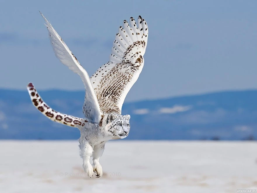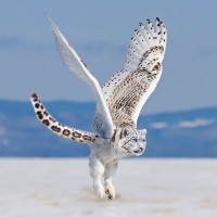 a snowy owl in flight. It is a bird with distinctive white and black plumage, known for its large wingspan that allows it to glide effortlessly over
