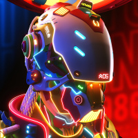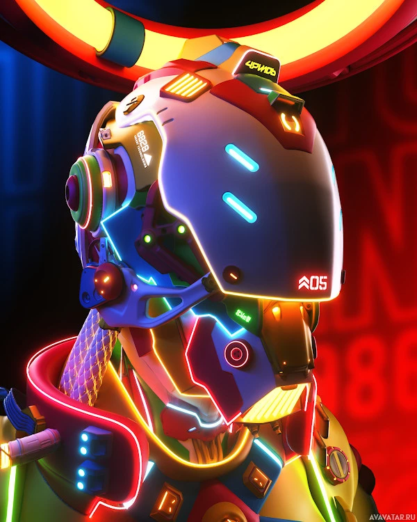 advanced technology designed for communication or sensory functions. The color scheme includes vibrant hues like neon blues, purples, and yellows, which add to