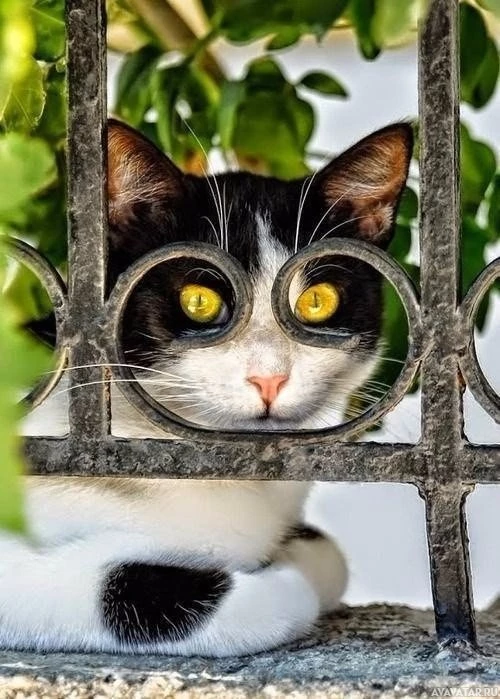 yellow eyes sitting behind a black iron gate. The cat appears curious and is peering through the holes in the gate, which are shaped like circles or perhaps