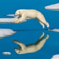 На снимке изображен арктический белый медведь, который прыгает через часть замерзшей океанской воды. Эта сцена демонстрирует замечательную ловкость и силу медведя, поскольку он перемещается по ледяному ландшафту.