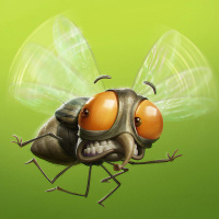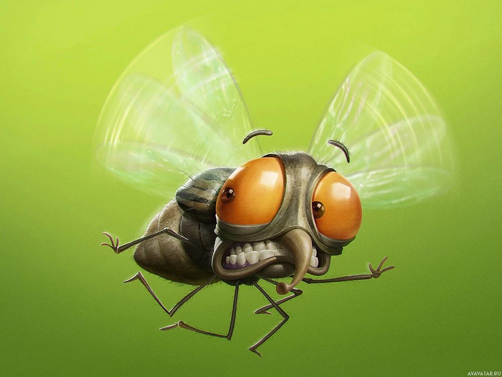 The image features a stylized cartoon depiction of an insect, specifically resembling a mosquito or fly. It has large