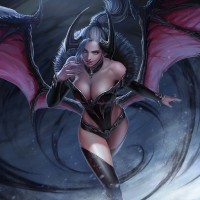 supernatural creatures, along with an attire that suggests a dark and seductive nature. The artwork is detailed, showcasing a blend of human-like features with