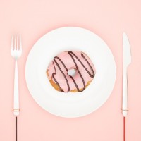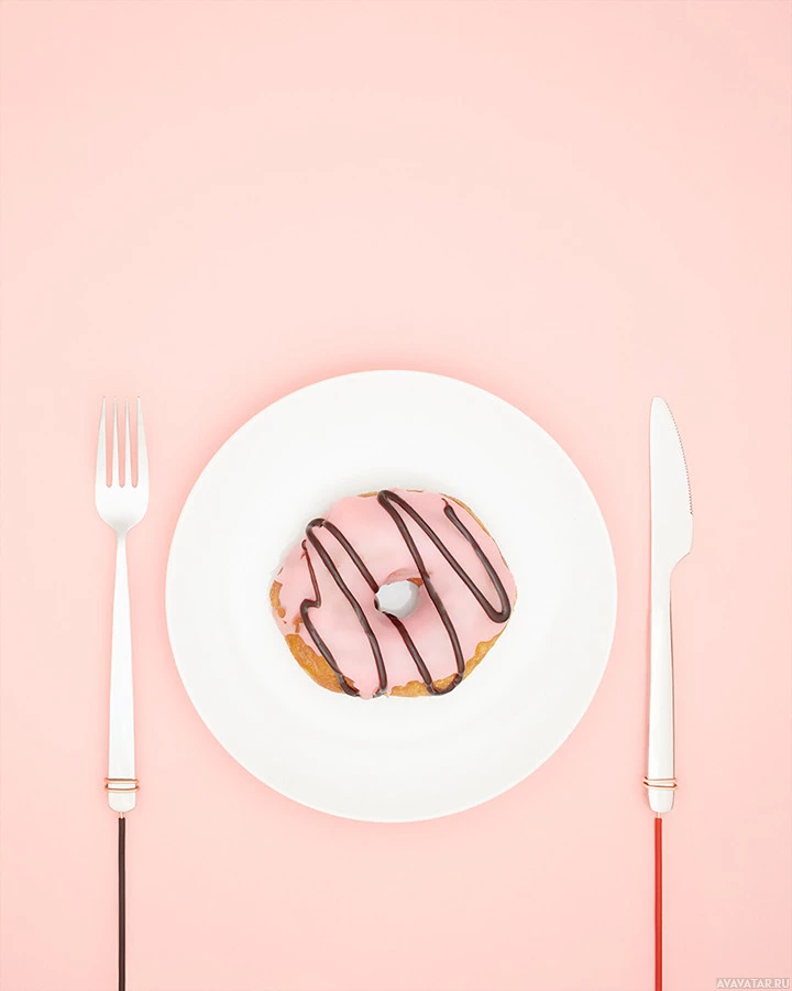 white plate. Next to the plate are silverware items: a fork and knife. There is also a spoon in front of the plate. The background appears to be pink with some