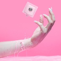 a small object floating in the air above the hand that looks like a compact or lip gloss container. It's difficult to identify specific brands or products without additional context. The background is plain and does not provide any significant details about the setting.