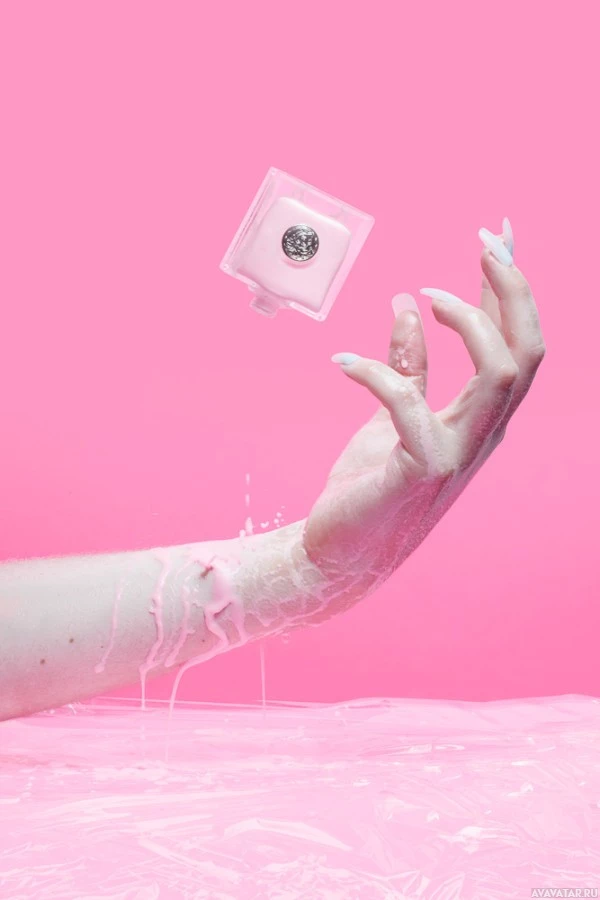 a pink liquid, with the fingers slightly curled as if holding or manipulating something. There is