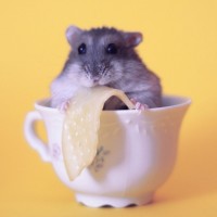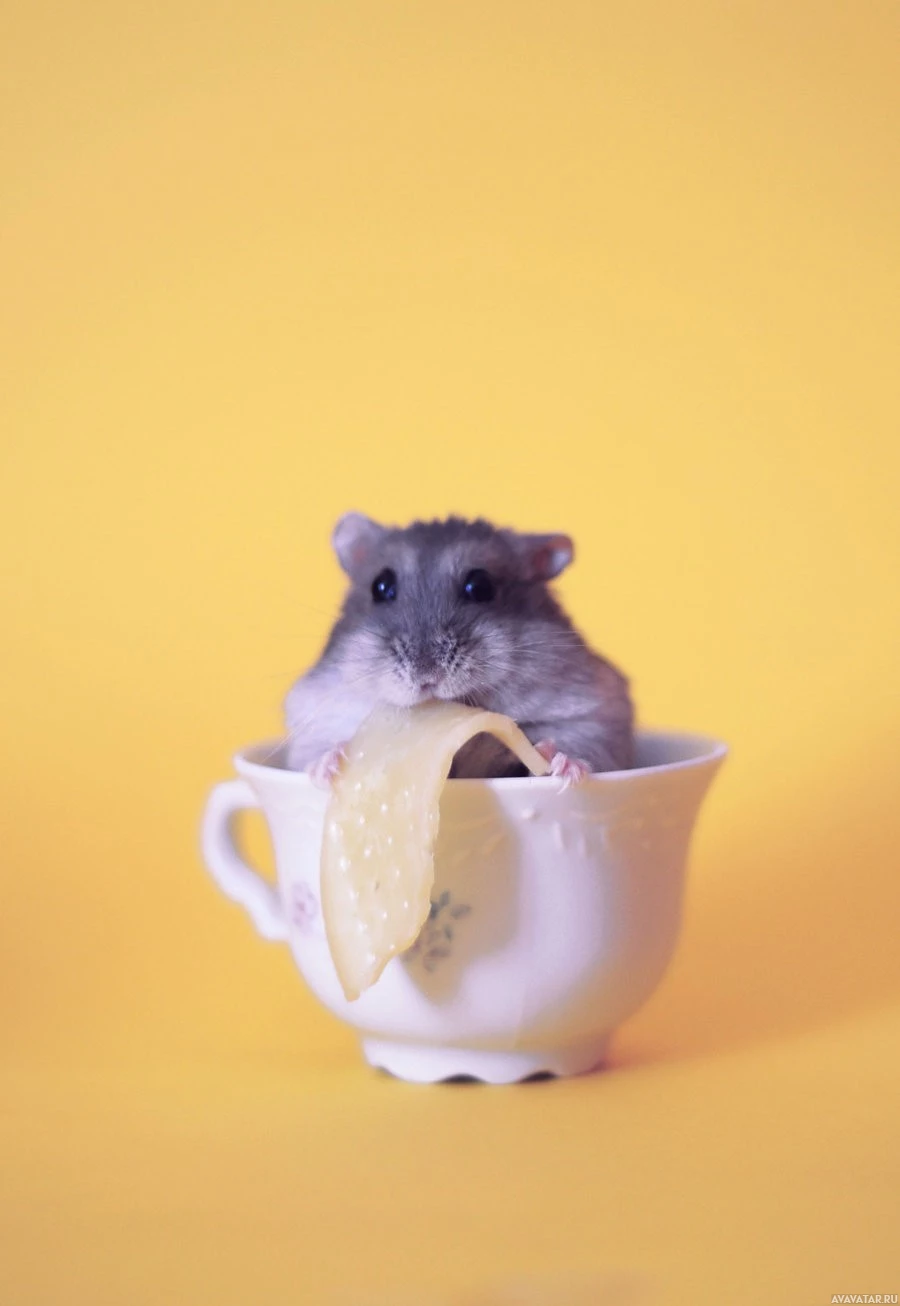 a small rodent, which appears to be an animal like a hamster or gerbil, inside a teacup. The animal is interacting with what looks like