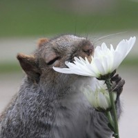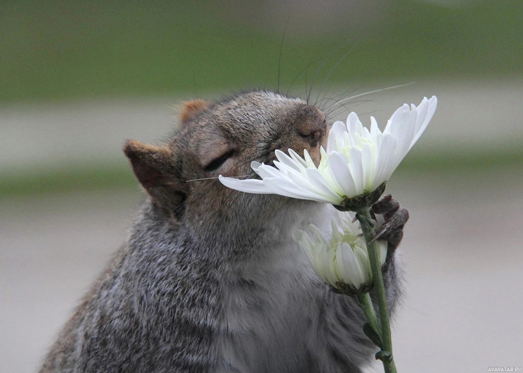 На картине изображена белка с открытым ртом, которая, кажется, что-то нюхает или пахнет. Он стоит рядом с белым цветком, который может быть ромашкой. На картинке людей не видно.
