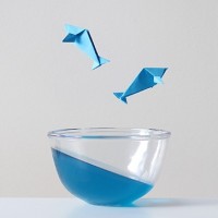 origami fish being tossed or floating in the water. The bowl is placed on