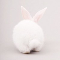 На снимке изображен маленький милый кролик с белым мехом и розовато-коричневыми ушами. Он стоит на гладкой серой поверхности. На заднем плане присутствует градиентный эффект наложения, который добавляет художественной композиции фотографии.