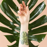 tropical foliage. There appears to be some form of tattoo or mark on the wrist, although it's not clearly visible due to the angle and distance from which the photo was taken. The background seems to be a solid