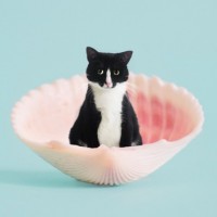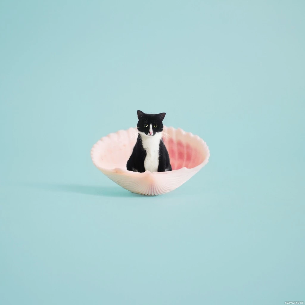 На снимке изображена черно-белая кошка, сидящая внутри открытой ракушки. Морская раковина розовая и размещена на синем фоне. Кошка выглядит спокойной и расслабленной, тело которой обращено прямо к зрителю.