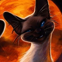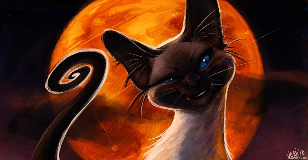 blue eyes, sitting in front of a full moon. The cat's fur is detailed and appears to be dark-colored with lighter markings around its face. It looks like the cat could be a character from a story or a piece of digital artwork designed to evoke a fantastical atmosphere, perhaps due to the whimsical design and