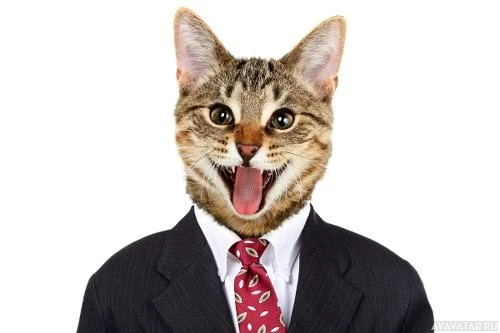 a human face superimposed onto it. The cat is wearing a suit and tie, suggesting a professional or formal context. This type of image is often created for