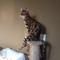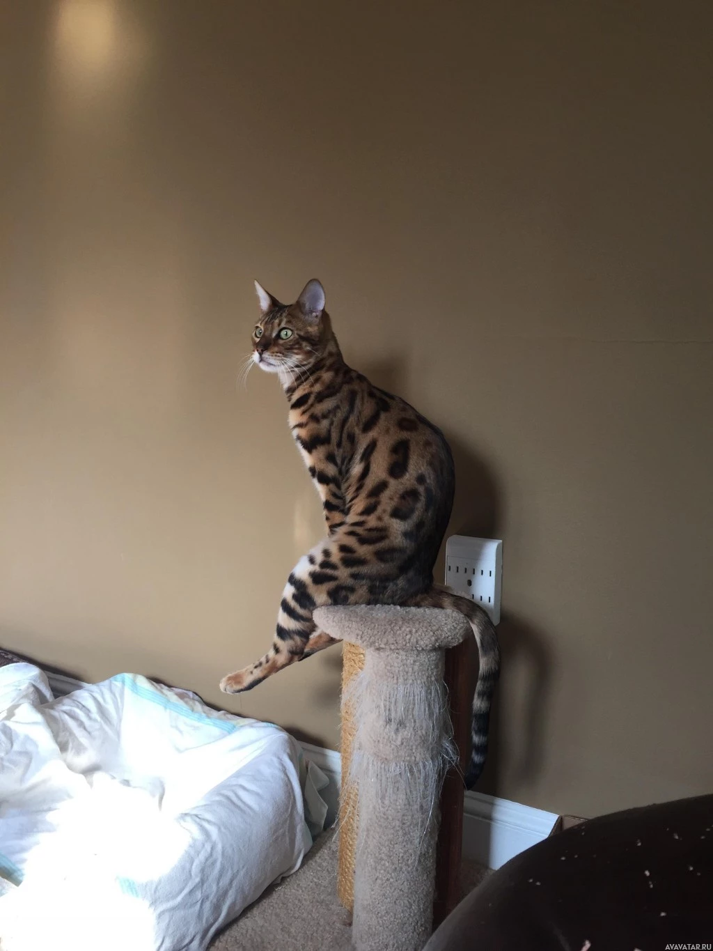 Это изображение бенгальской кошки, сидящей поверх царапающего поста в помещении. Кошка выглядит настороженной и может смотреть в сторону камеры или наблюдать за ее окружением. Он имеет отличительные отметины со смесью темных полос, пятен и вихрей, которые характерны для уникального меха этой породы.