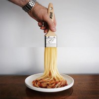 creative presentation of the food. Additionally, it can be inferred that a brush might have been used earlier to coat the pasta with sauce, as the person is now pouring more directly from the spoon into the bowl.