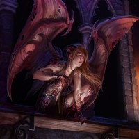 body of a human, but instead of arms and hands, it has wings. It is perched on a ledge that appears to be part of a castle or cathedral architecture, with