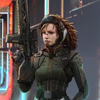 a video game or a science fiction setting. The character's outfit includes a vest with various gadgets and equipment, suggesting she might have