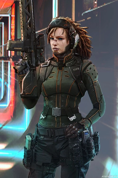 a female character dressed in a futuristic military-style uniform. She is holding what appears to be a high-tech weapon, possibly from