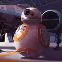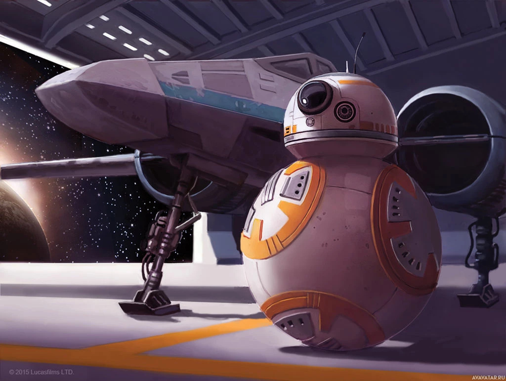 the Star Wars franchise, featuring a character known as BB-8. BB-8 is a droid belonging to the Resistance, and it's often seen accompanying other characters such as Finn or Rey. In this picture, we see BB-8 standing next to a spacecraft that appears to be a TIE Interceptor from the Imperial forces, suggesting a conflict scenario within the Star