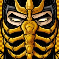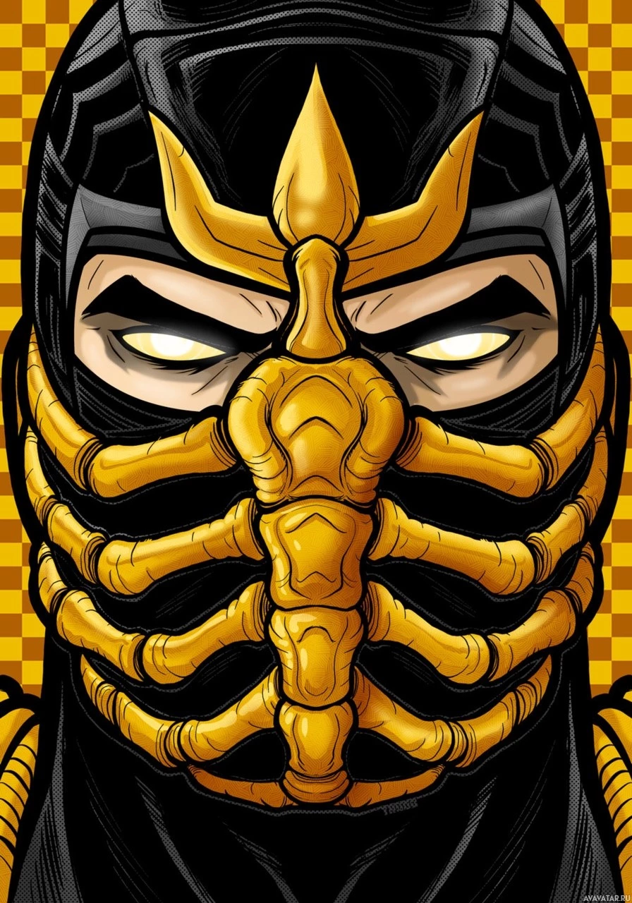 iconic mask, which is yellow and black in color, giving him a menacing appearance. The background has