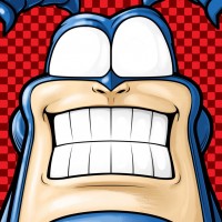 The image features a character from the animated movie "The Tick." This character is known as The Tick, and he is depicted with his signature smile that spans his face. He is wearing his iconic blue mask with white eyes.