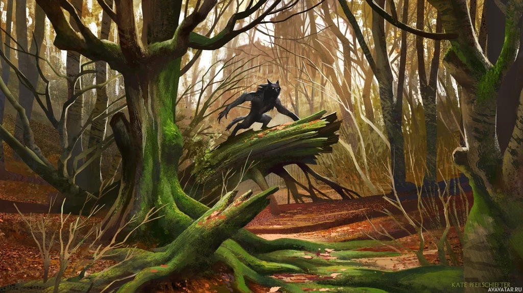 an autumnal feel. There is a misty quality to the scene, which could indicate that the werewolf is in motion or that it is