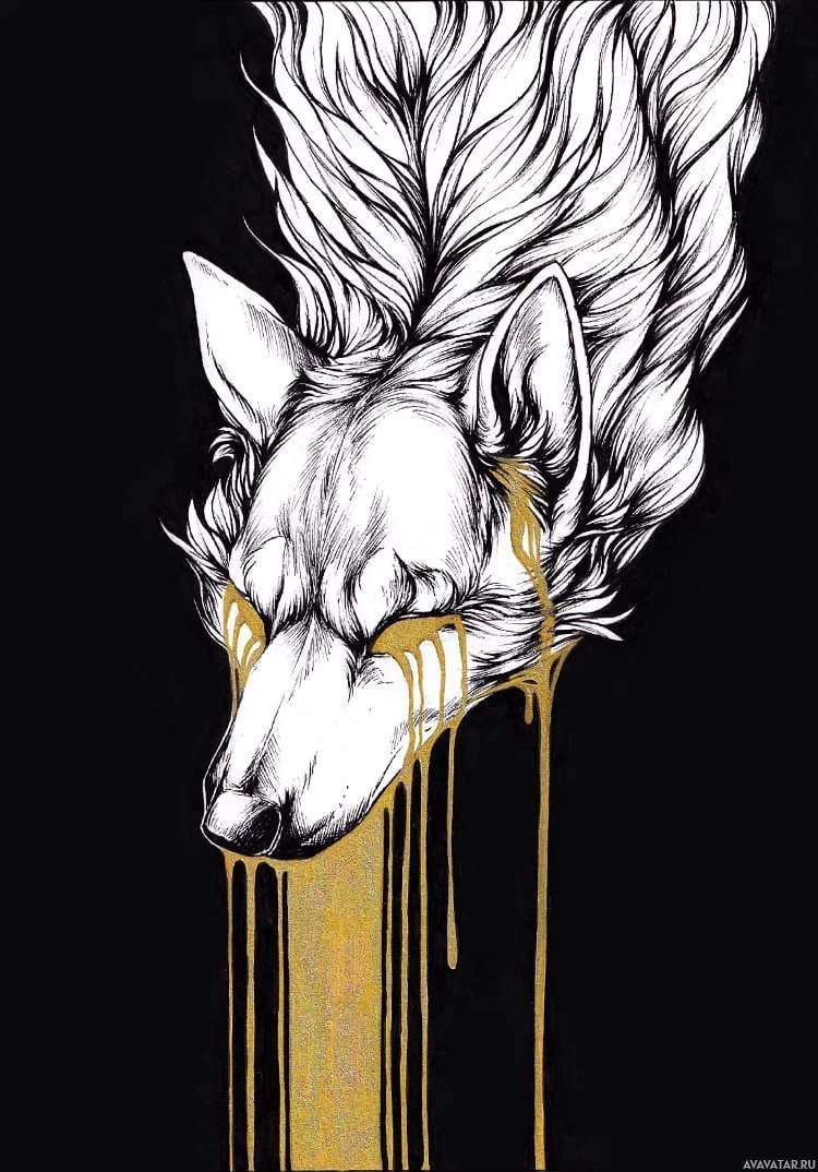 The image shows a wolf's head with a detailed illustration. It appears to have a sad or contemplative expression, as suggested by the droplets coming from its nose and eyes, which may imply tears. The color scheme is predominantly black and white, but there are some