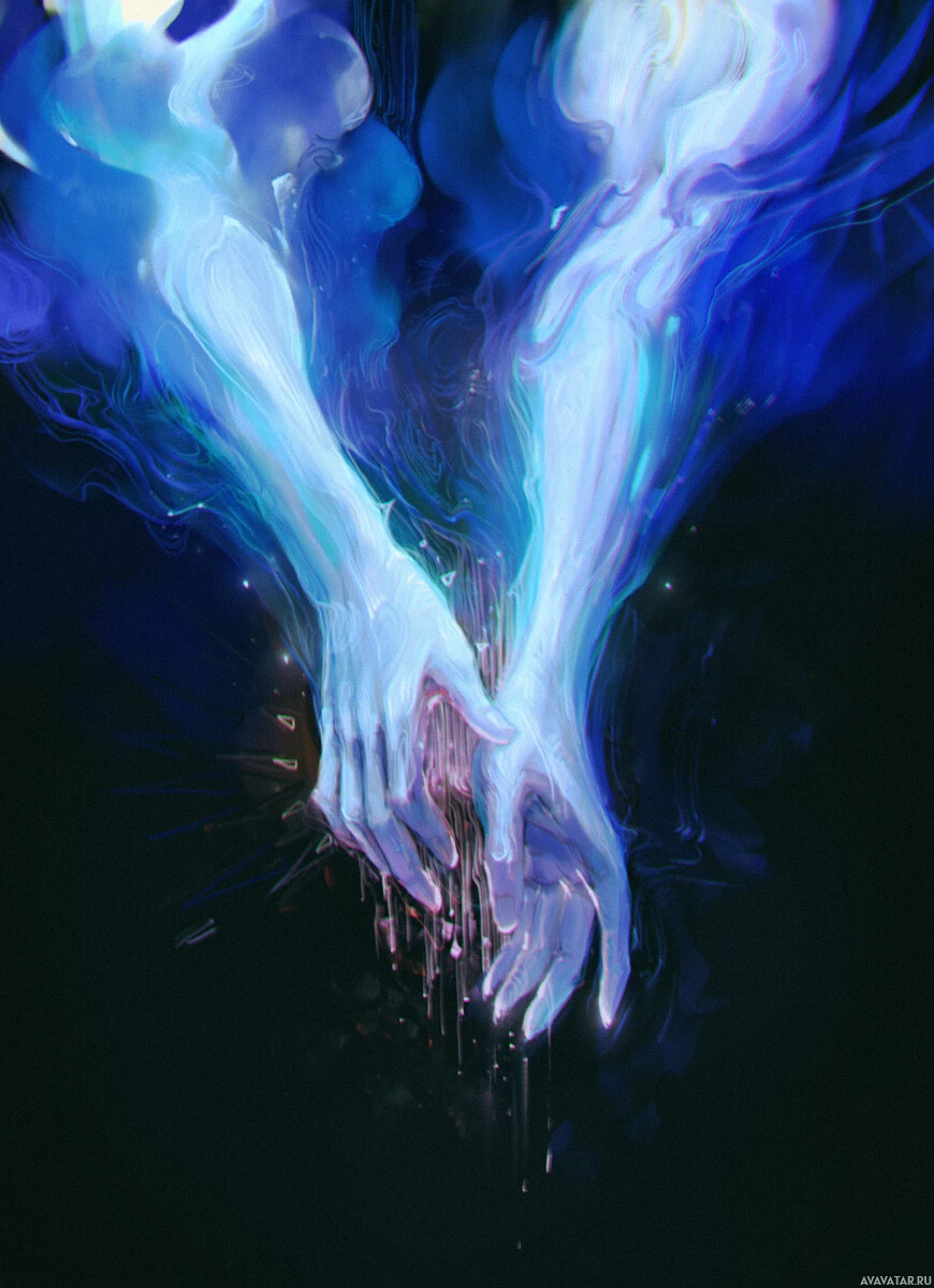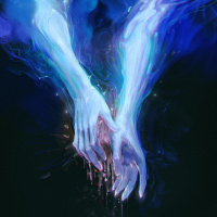 merging design. Their hands appear to be blending into each other or intertwined in a way that suggests unity or