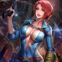 a female character with red hair, wearing an outfit that resembles the iconic Vault Dweller's jumpsuit from the "Fallout" video game series. She is holding a gun in her right hand and appears to be standing amidst destruction, which is reminiscent of