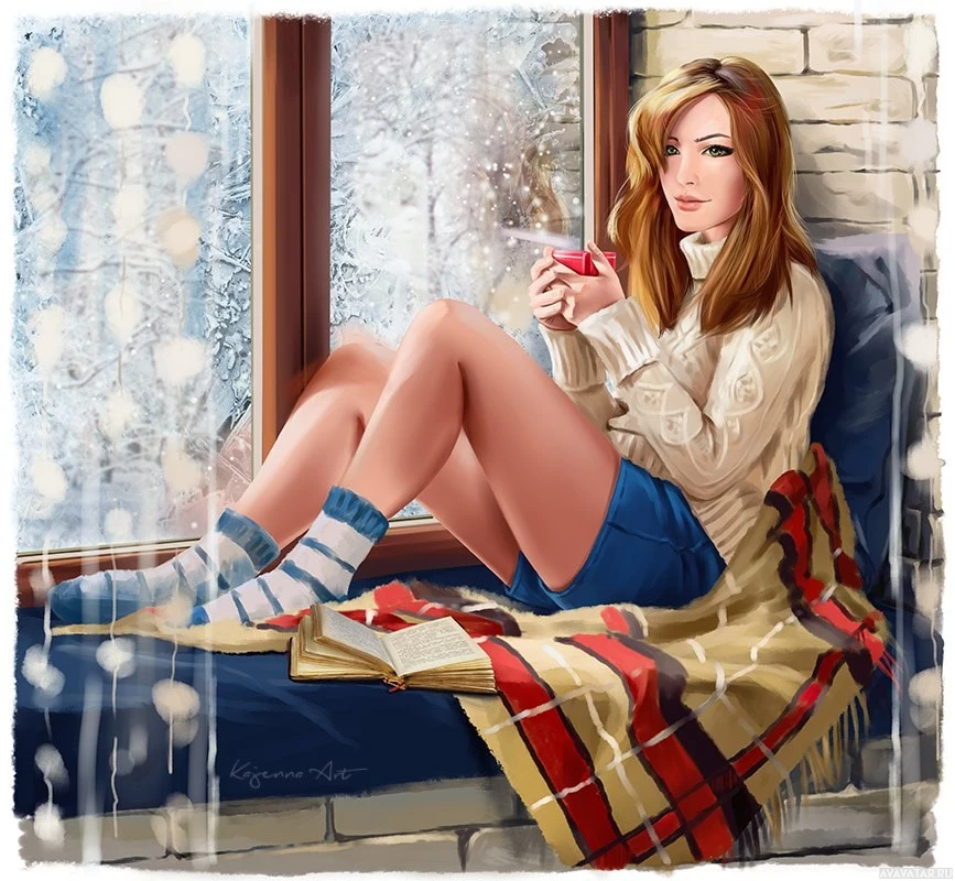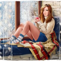 a cup of tea or coffee and seems to be enjoying a relaxing moment indoors during what might be rainy weather, as indicated by the droplets on the glass. The girl is wearing a cozy sweater and her legs are crossed in