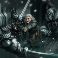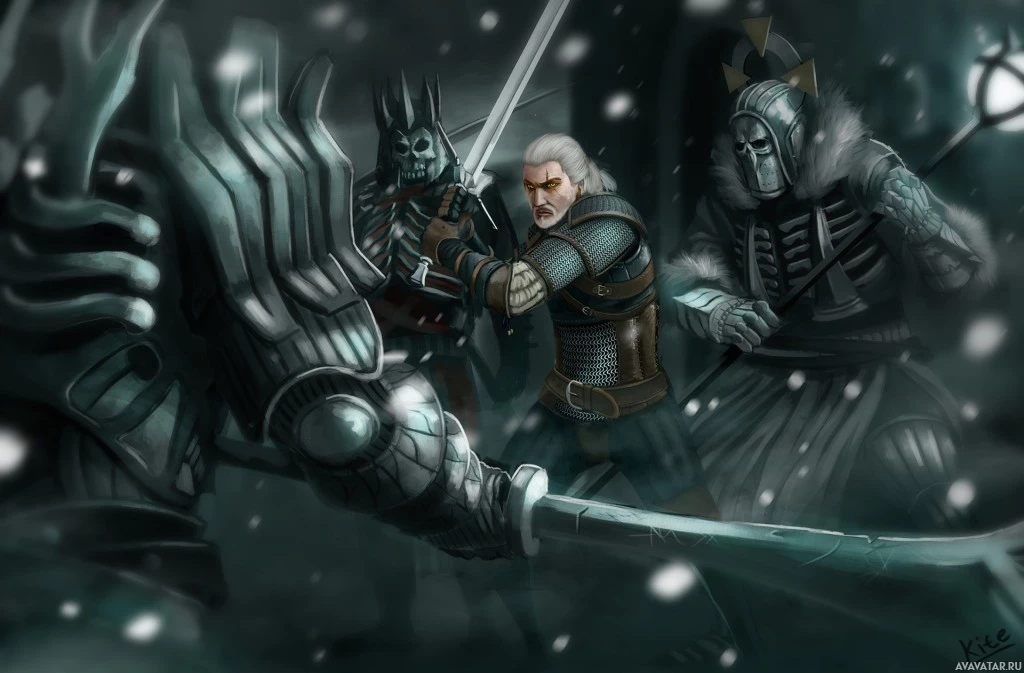 a snowy setting, with his sword drawn and ready for combat. The monsters appear to be werewolves or other
