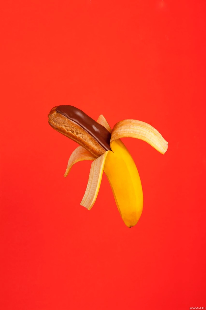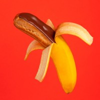 The image shows a banana with a chocolate-covered biscuit stuck onto it. It appears to be a creative dessert or snack concept, combining the fruit and confectionery elements for an appealing