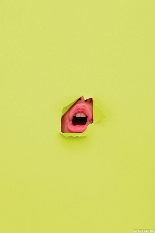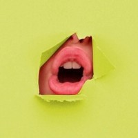 a yellow background with horizontal stripes, while the lower half displays a grayish tone. The lips are prominent in both halves of the image. This creates an interesting visual effect that seems to highlight
