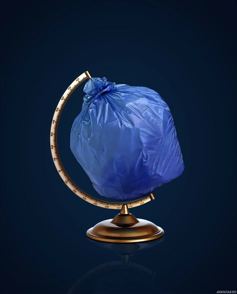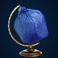 a plastic bag wrapped around it. The globe appears to be a standard representation of the Earth, colored blue and featuring lines representing longitude and latitude. On top of the globe sits a plastic bag that is predominantly blue in color, with visible creases indicating it has been used or handled. The bag seems to be secured onto the globe, possibly by tape or another form of binding. The background of the image is plain and does not provide any additional context or setting for the objects displayed.