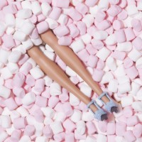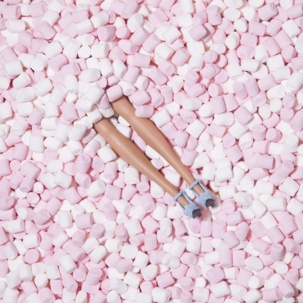 На этом изображении изображена пара ног с ногами в сандалиях, торчащая из кучи розовых и белых зефирных конфет. Ноги, по-видимому, являются частью куклы или аналогичной игрушки, так как ноги не прикреплены к туловищу или телу. Ноги расположены таким образом, что это создает иллюзию того, что человек будет похоронен или погружен в талию в этих сладких угощениях.