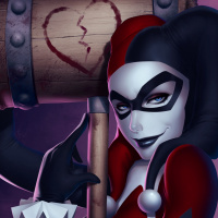 Harley Quinn, a character from the DC Comics universe. She is depicted holding a hammer with