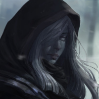 a hooded cloak that drapes over their shoulders. The background suggests a misty or foggy environment that could be part of a forest, indicating a setting that might be mysterious or enchanting. The artwork displays a high