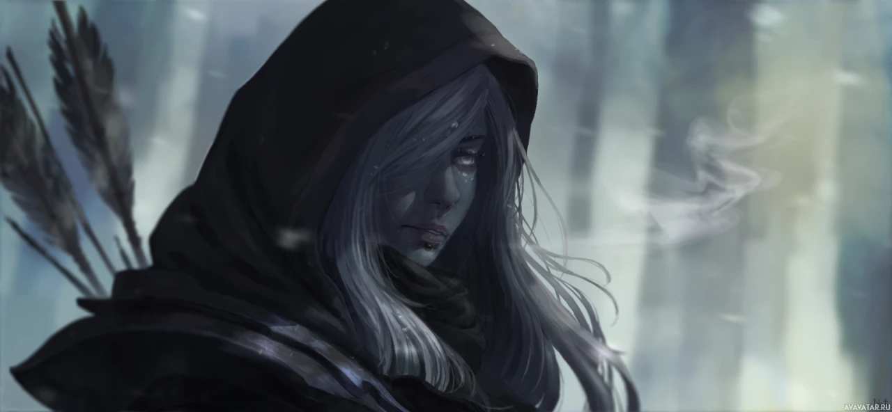 a fantasy setting, possibly inspired by a "Drow" character, which is commonly associated with dark-skinned elves in the Dungeons & Dragons role-playing game. This character has long silver hair and is wearing