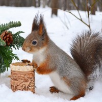 front paws resting on what seems to be a container or a box. The animal's fur is typical of winter-adapted squirrels, suggesting that it is prepared for