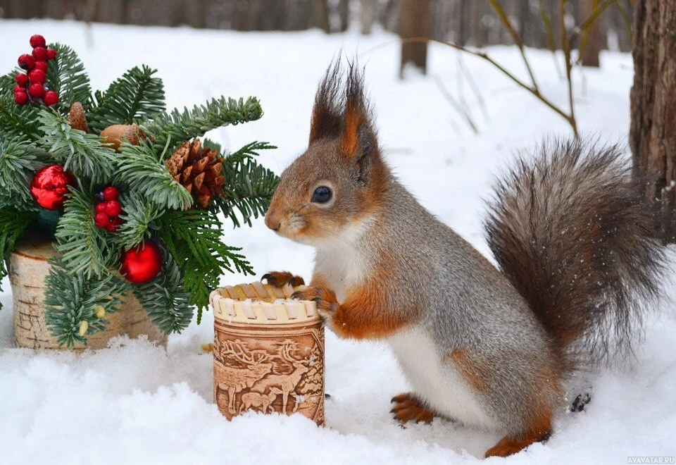 red berries and pine cones as decorations. The squirrel is facing towards the camera with its
