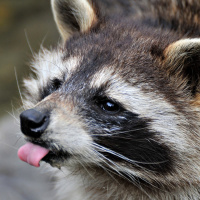 The image depicts a raccoon, which is an animal. The raccoon's tongue is out and it appears to be licking its face, possibly grooming itself or tasting the air. Raccoons are known for their