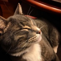 tabby cat with its eyes closed, appearing to be sleeping or very relaxed. It has