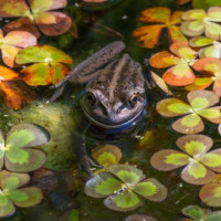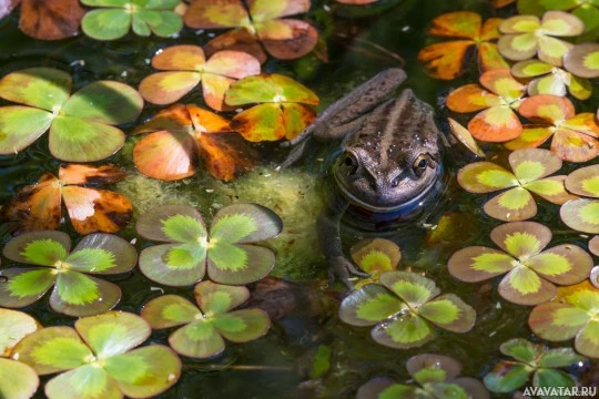 На картинке изображена маленькая лягушка, сидящая на подушечках лилии в водоеме. Лягушка имеет отличительную маркировку и окружена зелеными листьями растений.