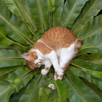 an optical illusion where the cat's body lines up perfectly with the leaf pattern to create the impression that it blends into the surroundings.