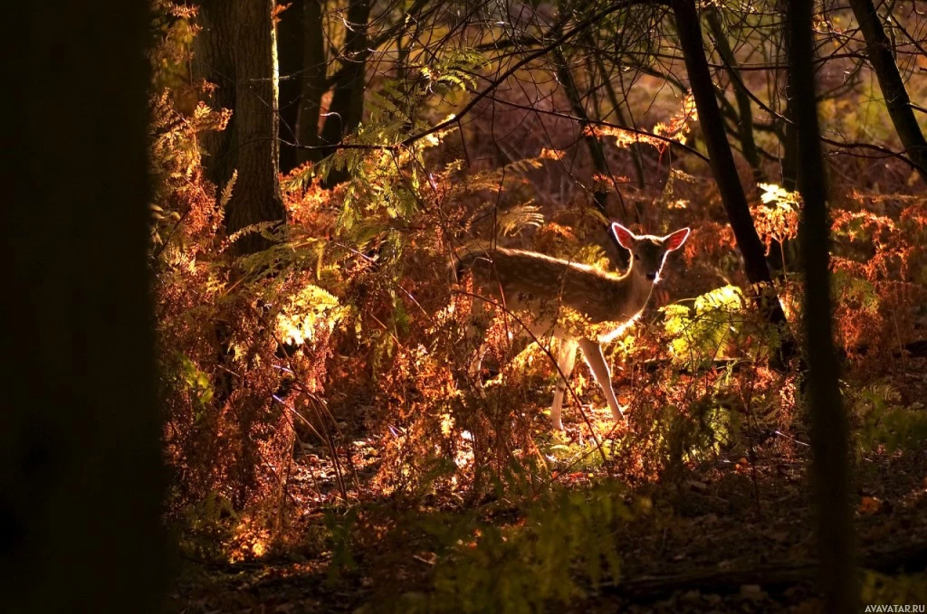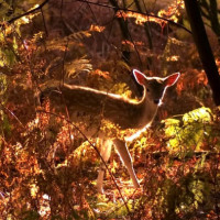 autumn colors, possibly during dusk or night given the low light conditions. The deer is silhouetted against the lighter background of