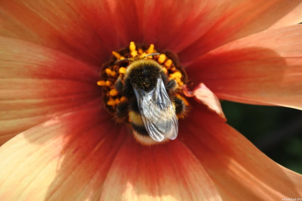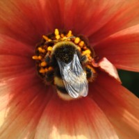 yellow anthers visible around the bee. The bee itself has distinctive black and yellow stripes that are characteristic of bumblebees.