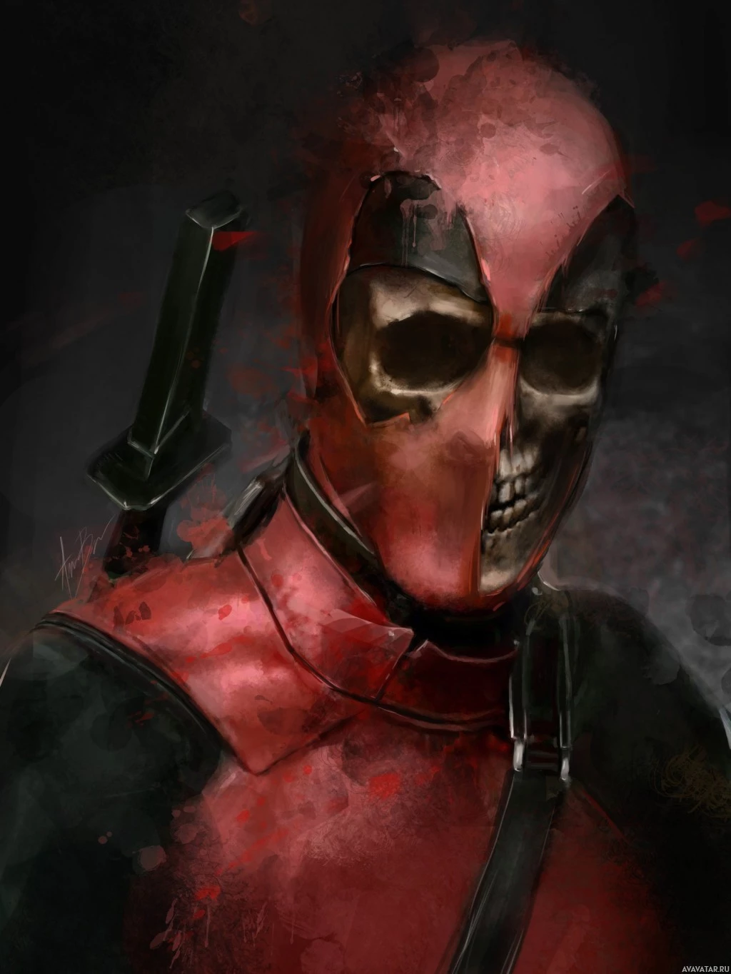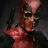 The image features a character known as Deadpool, who is a fictional antihero from the Marvel